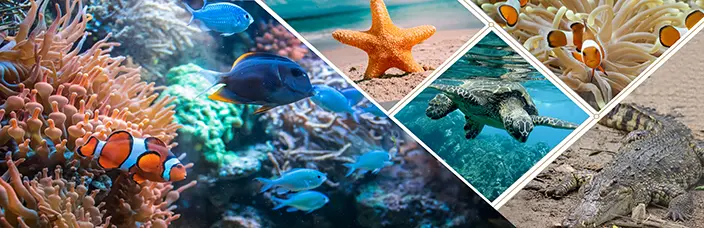 Water snakes, starfish, bright angles, salt-water crocodile, turtles, shells, starfish, ocean