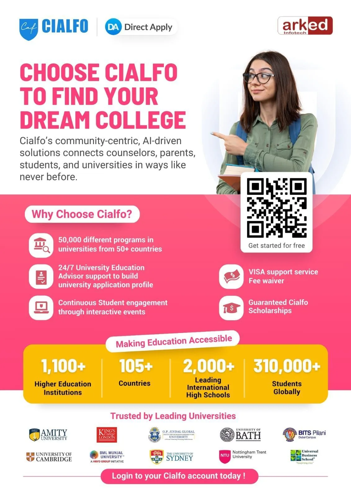 Whether you are a high school student just starting to think about universities and colleges or you are deep in the middle of the application process, Arked Infotech in association with Cialfo can help you to select best-fit courses and majors from over 1,000 universities in 50 countries to get started into your desired career.